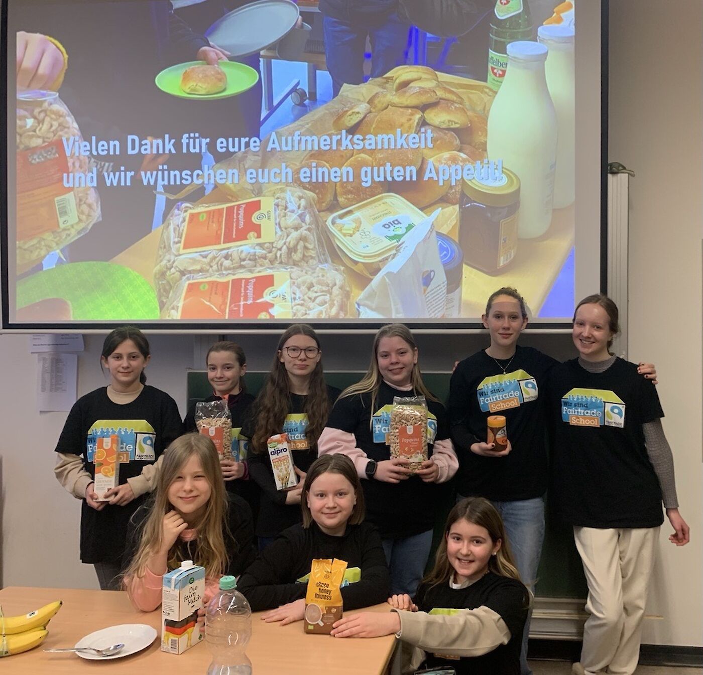 Zunächst infor­mier­ten Schü­le­rin­nen des Fair­­tra­de-Teams in den Klas­sen über die Her­kunft der Pro­duk­te und die Grund­sät­ze des Fai­ren Han­dels, dar­un­ter fai­re Bezah­lung, kei­ne aus­beu­te­ri­sche Kin­der­ar­beit und gute Arbeits­be­din­gun­gen.